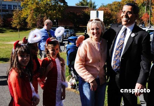 當(dāng)?shù)貢r間十月三十一日下午二點,美國弗吉尼亞埃西蘭小學(xué)舉行一年一度的全校萬圣節(jié)假面游行,圖為當(dāng)該校校長米蘭達(dá)先生扮演的總統(tǒng)參選人“奧巴馬”出現(xiàn)在孩子們面前,孩子們發(fā)出了陣陣的歡呼:“奧巴馬!奧巴馬”。中新社發(fā) 邱江波 攝