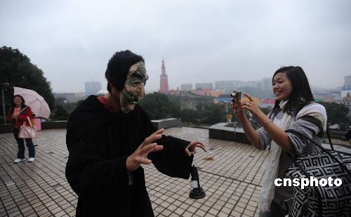 圖為長沙世界之窗公園內(nèi),游人拍照,黑“鬼”張牙舞爪,共狂歡。中新社發(fā) 肖前輝 攝