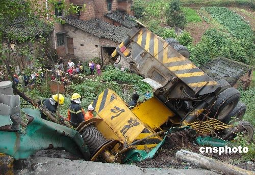 圖為事故吊車(chē)撞出護(hù)欄側(cè)翻。