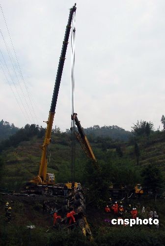 11月2日11時(shí)50分許,渝黔高速公路重慶至一品段10公里處,一輛長(zhǎng)江牌吊車(chē)因爆胎導(dǎo)致車(chē)輛失控,沖出護(hù)欄發(fā)生側(cè)翻,造成1人死亡,1人重傷。中新社發(fā) 張東清 攝