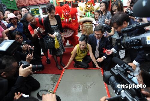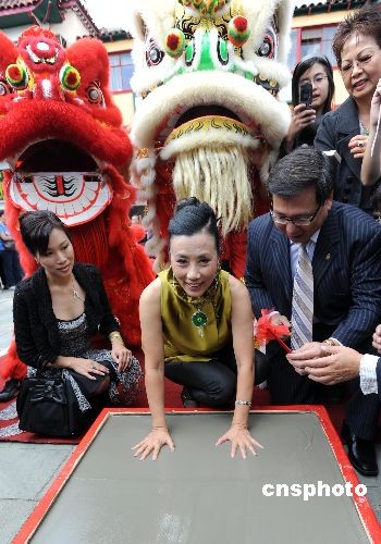 十一月二日,香港著名演藝明星汪明荃來到洛杉磯中國城,在中央廣場留下手印。主辦該活動的羅省中華總商會會長莊佩源稱贊汪明荃為傳播中華文化作出重要貢獻(xiàn),是所有華人的驕傲。香港明星周潤發(fā)與曾志偉等已在中國城中央廣場內(nèi)留下手印和簽名,羅省中華總商會表示,他們會繼續(xù)邀請為華人爭光的知名人士來此留手印,希望這里成為洛杉磯的第二個星光大道。中新社發(fā) 張煒 攝