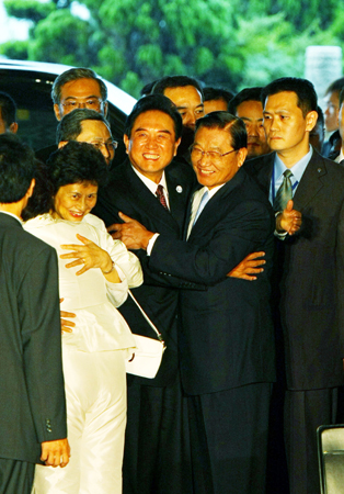 大陸海協(xié)會會長陳云林(右三)三日率協(xié)商代表團來臺,進入臺北圓山飯店后,與海基會董事長江丙坤(右二)熱情擁抱。