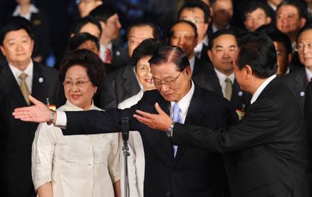 大陸海協(xié)會會長陳云林(前右)三日率協(xié)商代表團(tuán)來臺,在臺北圓山飯店致詞后,與;鶗麻L江丙坤(前右二)相互禮讓。