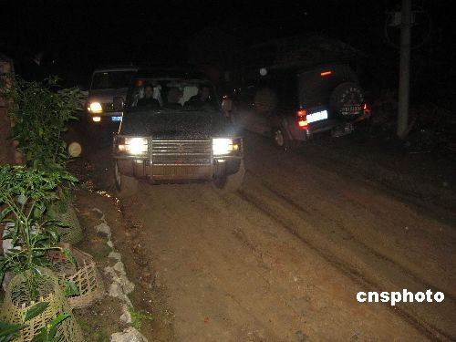 四日凌晨在普洱景東太忠鄉(xiāng)到災區(qū)的路上,楚雄救援醫(yī)療隊救援車陷進了泥潭里。中新社發(fā) 劉子倩 攝