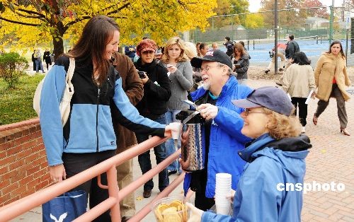 在臨近華盛頓的弗吉尼亞阿靈頓郡中心圖書館投票站,很多選民因為起得早,沒有吃早飯,此時來了兩位送餅干和熱咖啡的?墒,這兩位開口就問:你是奧巴馬的投票者么?一位女士說“Yes!”,于是馬上咖啡餅干免費(fèi)奉上。中新社發(fā) 邱江波 攝