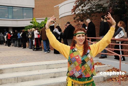 在臨近華盛頓的弗吉尼亞阿靈頓郡中心圖書館投票站,舞蹈家伊拉納在選民長隊前翩翩起舞,呼吁人們把票投給奧巴馬,她說,這樣才能夠讓美國重新贏得世界各國人民的尊重。圖為伊拉納載歌載舞拉選票。中新社發(fā) 邱江波 攝