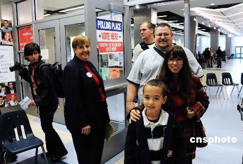 在臨近華盛頓的弗吉尼亞阿靈頓郡華盛頓·李高中投票站,愛德華夫婦和兒子亞當(dāng)今天一大早來到投票站,愛德華告訴記者,他們的票投給了奧巴馬,只有他能夠帶領(lǐng)美國恢復(fù)美國在世界的領(lǐng)導(dǎo)地位。中新社發(fā) 邱江波 攝