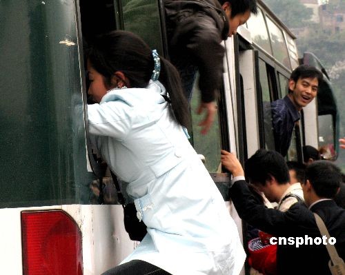 重慶主城區(qū)出租車罷運事件11月4日上午仍在持續(xù),但從重慶市出租汽車協(xié)會了解到,截止4日下午16點30分,重慶主城區(qū)共有4000多輛出租車上路營運,占全市主城區(qū)出租車數(shù)量的一半,持續(xù)到4日上午的罷運事件出現(xiàn)良好轉(zhuǎn)機(jī),但仍嚴(yán)重影響市民出行,在南坪區(qū)出現(xiàn)了部分市民為了趕車回家攀爬公交車的情景。中新社發(fā) 許康平 攝