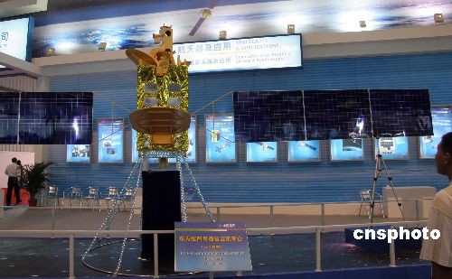 圖為中國(guó)航天科技集團(tuán)公司研制的新一代通信衛(wèi)星研制平臺(tái)“東方紅四號(hào)”模型在航展上展出。中新社發(fā) 孫自法 攝