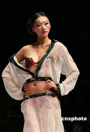 2008年11月5日,中國(guó)國(guó)際時(shí)裝周(2009春夏系列發(fā)布)開(kāi)幕式——2008中華內(nèi)衣元素創(chuàng)新設(shè)計(jì)大賽在北京舉行。 本次大賽共收到全國(guó)27個(gè)地區(qū)(包括港澳臺(tái))和英國(guó)、日本的872組參賽作品,經(jīng)過(guò)評(píng)委的認(rèn)真評(píng)選,來(lái)自中國(guó)內(nèi)地、中國(guó)臺(tái)灣、英國(guó)和日本的24組參賽作品入圍。來(lái)自不同國(guó)家和地區(qū)的選手們從各個(gè)角度對(duì)漢代文化進(jìn)行各自的詮釋,將漢代文化的多元與繁榮表現(xiàn)地淋漓盡致。中新社發(fā) 魯谷 攝