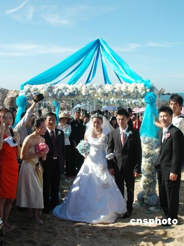 11月6日,2008北京奧運會體操“全能王”在海南三亞著名的天涯海角景區(qū)的愛情廣場的沙灘上舉行盛大浪漫的婚禮,與新娘楊云經(jīng)過8年的愛情長跑,終于走進(jìn)婚姻的殿堂。楊威和新娘楊云登上熱氣球,演繹空中浪漫。中新社發(fā) 尹海明 攝