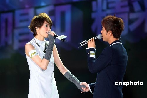 梁詠琪、李克勤在慈善音樂會(huì)上深情對(duì)唱。