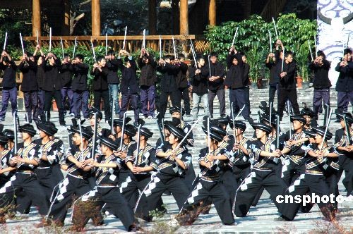 11月9日,貴州黔東南雷山縣幾千苗族同胞進(jìn)行采排,為2008年11月10日舉行的雷山苗年開幕式作準(zhǔn)備,采排現(xiàn)場(chǎng)盛況空前,許多游客前往圍觀。貴州黔東南苗族侗族自治州著名旅游點(diǎn)雷山縣西江千戶苗寨有“中國(guó)天然苗族博物館”、“中國(guó)苗族文化中心”、“中國(guó)著名景觀村落”之譽(yù)。中新社發(fā) 吳興權(quán) 攝