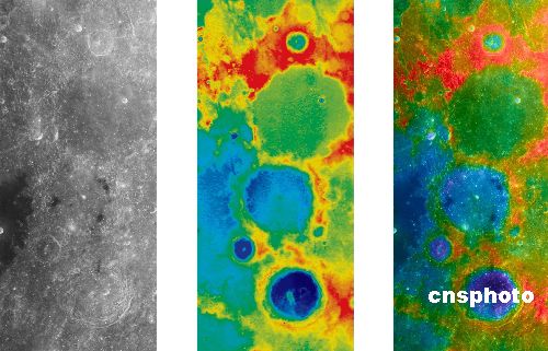圖為2007年12月11日,中國國家航天局發(fā)布的由“嫦娥一號”衛(wèi)星11月26日獲取的6軌立體相機數(shù)據(jù)拼接而成的“嫦娥撞擊坑”。