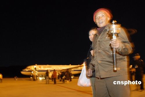 80多歲的邊巴老人在家人的陪同下登上了拉薩飛往成都的首架夜航航班。中新社發(fā) 龍昊 攝