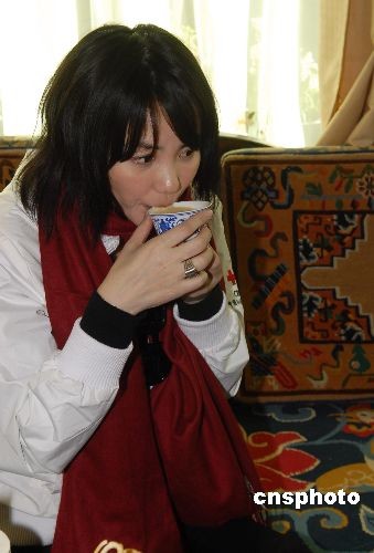 11月28日下午,王菲、李亞鵬在西藏自治區(qū)紅十字會領(lǐng)導(dǎo)陪同下,來到拉薩城關(guān)區(qū)當(dāng)巴居委會,看望一歲的唇腭裂患兒小央金,并為小央金送去慰問金和禮物。首次做客藏家的王菲、李亞鵬夫婦顯得很愉快,并不時招呼現(xiàn)場記者一同品嘗具有西藏特色的綠色食品炒青稞。期間,李亞鵬在主人招呼下品嘗了西藏的青稞酒,而王菲則學(xué)喝了獨具西藏口味的酥油茶。中新社發(fā) 龍昊 攝