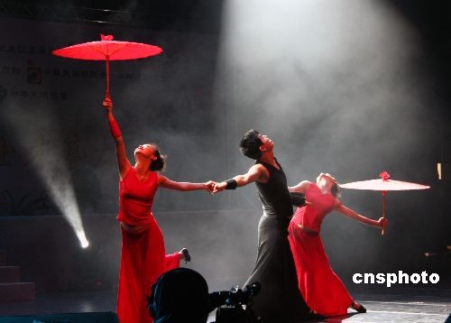 上海殘疾人藝術(shù)團(tuán)的聾人舞蹈演員在晚會(huì)上表演舞蹈《紅黑傘》。中新社發(fā) 周兆軍 攝