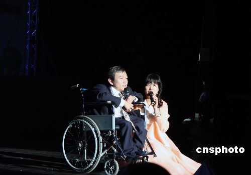 雙腿殘疾的劉銘(左)和雙目失明的朱萬花主持晚會(huì)。中新社發(fā) 周兆軍 攝