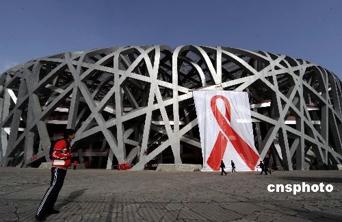 五個(gè)高20米、寬17米的巨型紅絲帶掛上北京的國家體育場“鳥巢”上。中新社發(fā) 廖攀 攝