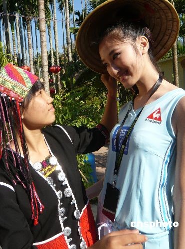 12月2日,正在海南三亞舉行的2008新絲路中國模特大賽總決賽的參賽選手進(jìn)行賽事活動,參賽的49名男女選手來到美麗的三亞檳榔河生態(tài)新村參觀。圖為黎族姑娘為參賽佳麗戴上斗笠。