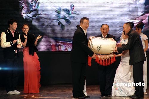 12月2日晚,陳凱歌執(zhí)導的電影《梅蘭芳》在北京中影懷柔影視基地舉行首映禮,片方陳凱歌、韓三平向梅蘭芳之子歸還其父使用過的“守舊”。梅葆玖曾將“守舊”借給《梅蘭芳》攝制組用于電影拍攝。中新社發(fā) 廖攀 攝