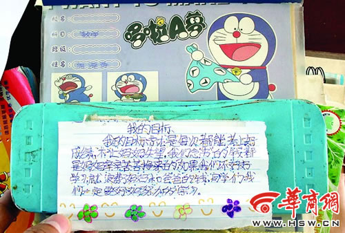 席海濤的文具盒上也有奮斗目標:“我的目標是每次都能考上好成績,不讓媽媽失望,我們念書的錢都是媽媽辛辛苦苦掙來的,如果我們不好好學習,就浪費了媽媽和爸爸的錢,同學們我們一定要好好努力的學習。”