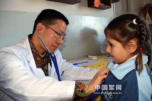 今天體檢的是該校幼兒園的小朋友。上午9點開始,中國維和軍醫(yī)對孩子們的身高、體重、五官、內(nèi)科、外科進行了全面體檢,并將檢查結果詳細記錄,交給該校老師存檔。皮膚科、婦科醫(yī)生則為慕名而來的當?shù)厝罕娺M行了義診。至中午12點,中國醫(yī)護人員共為該校幼兒園的100余名小朋友進行了體檢,治療20余名皮膚、婦科患者。