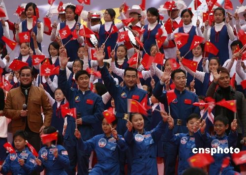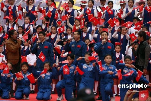 “神舟七號(hào)” 航天員翟志剛、劉伯明和景海鵬與香港藝人譚詠麟、李克勤合唱《龍的傳人》。中新社發(fā) 武仲林 攝