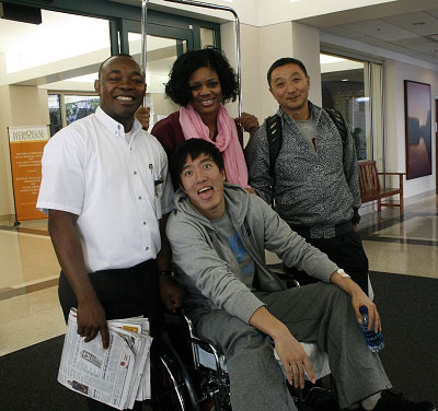 或許是在安靜的醫(yī)院待久了,好動的劉翔一出赫曼紀(jì)念醫(yī)院就沖著所有人做起了鬼臉,那個熟悉的劉翔又回來了。不過劉翔的這次亮相有點(diǎn)不同:“飛人”暫時棲息在輪椅上,右腳還包裹著厚厚的紗布,外面再加上一個高至膝蓋下方的護(hù)具。