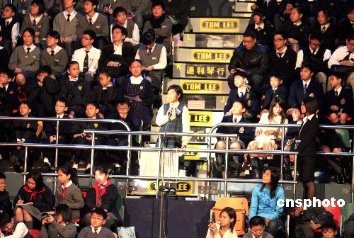 圖為中國載人航天工程辦公室主任及副團(tuán)長王文寶及三位航天員與香港學(xué)生真情對(duì)話現(xiàn)場,臺(tái)下的學(xué)生正在提問。中新社發(fā) 張勤 攝