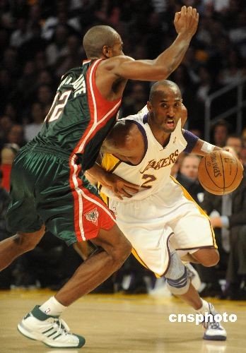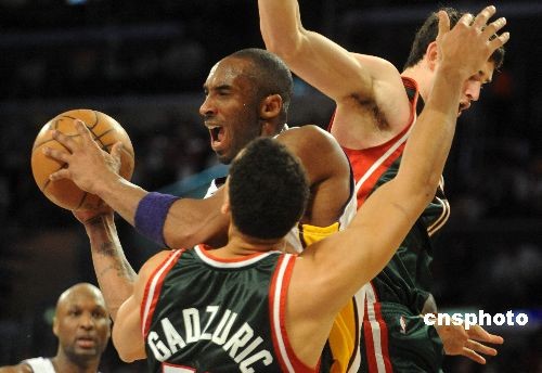 當?shù)貢r間十二月七日晚,NBA洛杉磯湖人隊在主場以一百零五比九十二輕取雄鹿隊。其中湖人后衛(wèi)科比·布萊恩特上場三十一分鐘,奪得二十分。中新社發(fā) 張煒 攝
