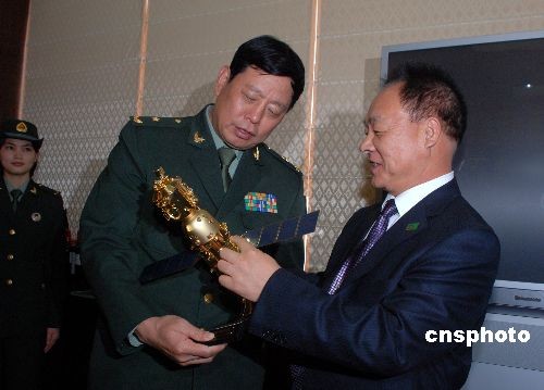 圖為代表團(tuán)團(tuán)長張建啟向駐澳門部隊司令員王玉仁贈送神舟七號飛船模型。中新社發(fā) 畢永光 攝