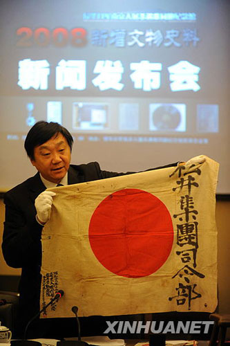 侵華日軍南京大屠殺遇難同胞紀(jì)念館館長朱成山在展示當(dāng)年侵華日軍在南京入城式時(shí)作紀(jì)念用的日本國旗。韓瑜慶 攝