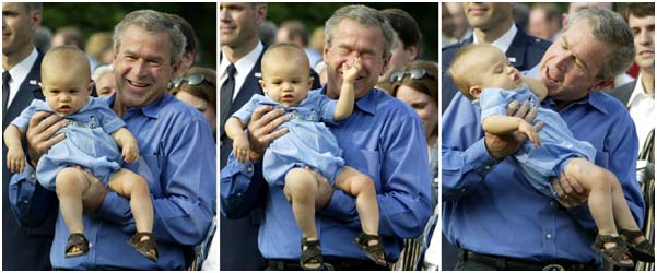 在白宮傳統(tǒng)的一年一度夏季野餐會(huì)上,美國(guó)總統(tǒng)布什在逗玩國(guó)會(huì)議員的兒子。