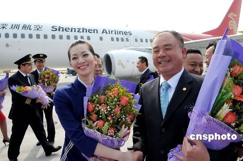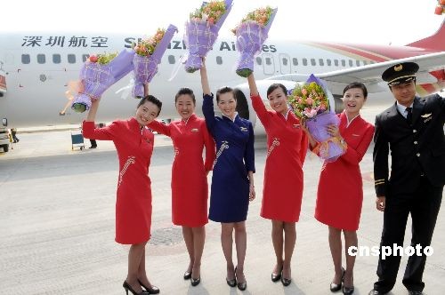 圖為擔(dān)任本次兩岸常態(tài)包機(jī)直航的深航空姐從臺北喜悅歸來。中新社發(fā) 陳文 攝
