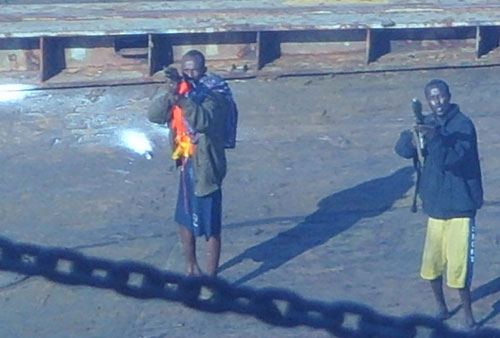 2艘小艇利用航速20多節(jié)的優(yōu)勢(shì),已經(jīng)靠上了“振華4號(hào)”,左側(cè)船頭,荷槍實(shí)彈的海盜真的爬上了船。