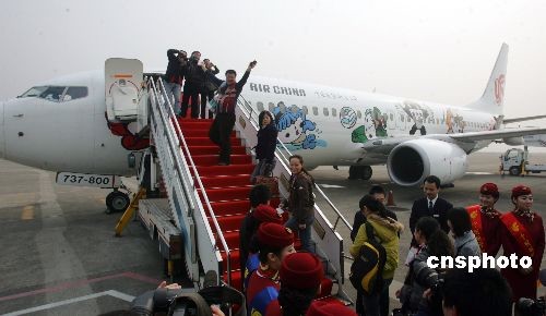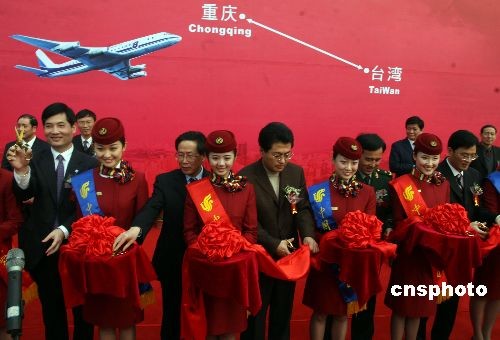 12月19日,重慶至臺北的直航航線正式開通。當日下午3時許,印有福娃圖案的國航班機從重慶江北機場起飛,駛向?qū)殟u臺灣。中新社發(fā) 郭晉嘉 攝