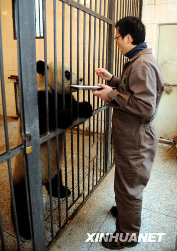 12月21日,臺(tái)北木柵動(dòng)物園飼養(yǎng)員正在學(xué)習(xí)照顧“團(tuán)團(tuán)”、“圓圓”。 從2008年10月開(kāi)始,臺(tái)北木柵動(dòng)物園的3名飼養(yǎng)員分兩批來(lái)到中國(guó)保護(hù)大熊貓研究中心四川雅安碧峰峽基地,學(xué)習(xí)大熊貓飼養(yǎng)技術(shù)。目前,他們和贈(zèng)臺(tái)大熊貓“團(tuán)團(tuán)”“圓圓”已經(jīng)建立感情,基本掌握了大熊貓飼養(yǎng)技術(shù)。