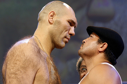 WBA 世界錦標賽的俄羅斯拳擊選手 Nikolai Valuev 與美國拳手 John Ruiz 的對峙瞬間。