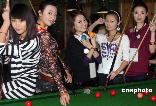 12月23日,正在北京參加2008世界亞裔小姐大賽中國區(qū)總決賽的佳麗在嘉年華游樂園游覽拍照,各種游樂項(xiàng)目吸引佳麗。圖為參賽佳麗練習(xí)打臺球。中新社發(fā) 錢興強(qiáng) 攝