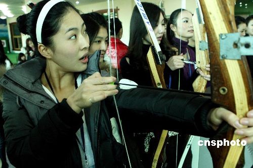 12月23日,正在北京參加2008世界亞裔小姐大賽中國(guó)區(qū)總決賽的佳麗在嘉年華游樂(lè)園里興高采烈游樂(lè)健身,圖為參賽佳麗練習(xí)射箭。中新社發(fā) 錢(qián)興強(qiáng) 攝