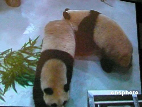 大陸贈(zèng)臺(tái)大熊貓“團(tuán)團(tuán)”“圓圓”二十三日晚間抵達(dá)臺(tái)北的新家——臺(tái)北市立動(dòng)物園新光特展館。圖為“團(tuán)團(tuán)”和往常一樣,喜歡跟在“圓圓”身后,如影隨形。