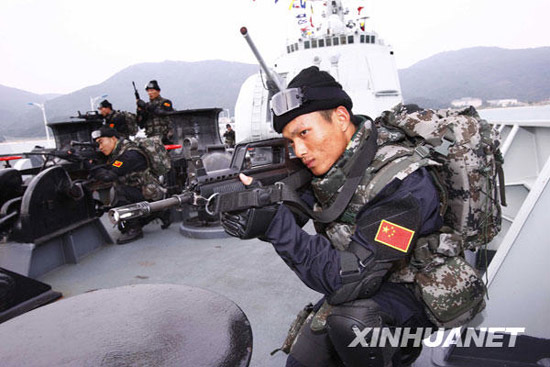 海軍特戰(zhàn)隊(duì)員在軍艦上訓(xùn)練。