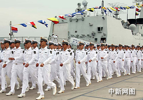 護(hù)航艦艇編隊(duì)官兵列隊(duì)從碼頭走過
