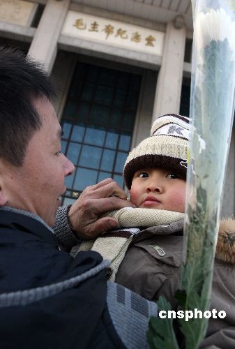 12月26日毛澤東115周年誕辰日清晨,一名四川地震災(zāi)區(qū)的三歲男童與父親到位于北京天安門廣場的“毛主席紀(jì)念堂”敬獻(xiàn)白菊鮮花,深切懷念偉大領(lǐng)袖毛主席。