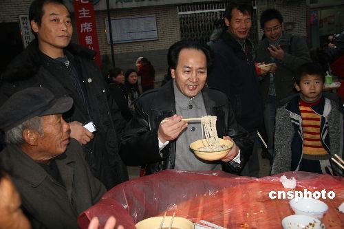 圖為“毛主席”特型演員與韶山民眾同吃“福壽面”。中新社發(fā) 鄧霞 攝