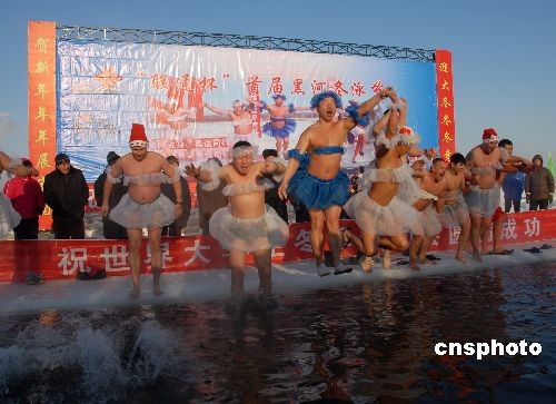 12月27日,首屆黑河市冬泳節(jié)開幕暨中俄健兒冬泳賀新年表演活動在界河黑龍江舉行。黑河市百余名冬泳健兒與來自俄羅斯布拉戈維申斯克市的20余名冬泳隊員進行了中俄雪地足球?qū)官、滑稽冬泳和跳水技巧表演等。旨在打造黑河地域特色旅游文化活動品牌,大力營造“兩節(jié)”期間喜慶和諧的文化氛圍。如今,中俄冬泳表演活動已經(jīng)成為展示黑河、宣傳黑河的“名片”。