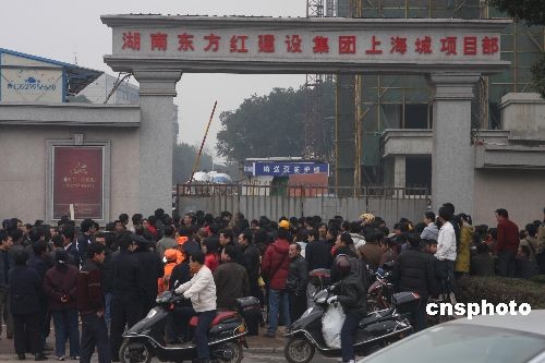 許多人在長(zhǎng)沙市井灣子韶山南路634號(hào)湖南東方紅建設(shè)集團(tuán)上海城19棟項(xiàng)目部發(fā)生建筑施工升降機(jī)掛籃墜落事故現(xiàn)場(chǎng)圍觀。中新社發(fā) 郭國(guó)權(quán) 攝