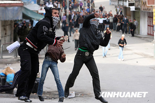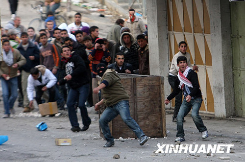 12月27日,在約旦河西岸城鎮(zhèn)希伯倫,巴勒斯坦人向以色列士兵投擲石塊。當日,上百名巴勒斯坦人在希伯倫抗議以軍空襲加沙,并與以色列士兵發(fā)生沖突。新華社記者 殷博古 攝