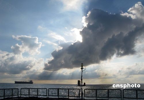 圖為在“?凇迸炍布装逅臄z的陽(yáng)光與烏云交相輝映的壯美觀景。中新社發(fā) 孫自法 攝